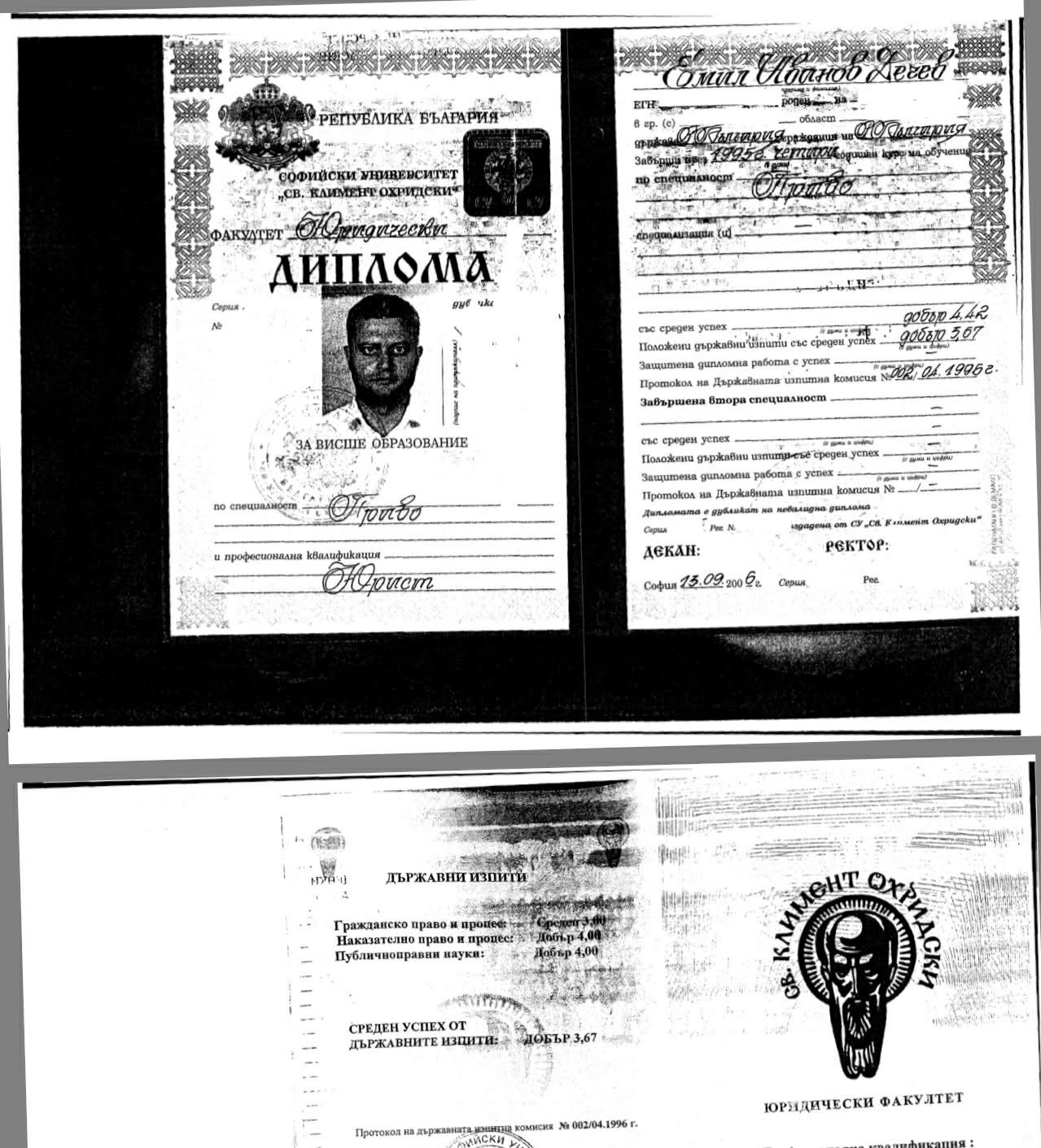 С общ успех от следването 4.42 и 3.67 на държавните изпити юристът Емил Иванов Дечев изгражда шеметна кариера, пише ПИК. Ето какво показват документите, които откри Соня Колтуклиева.