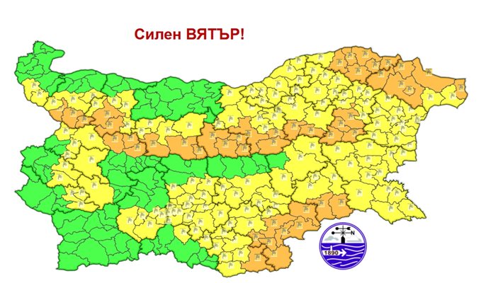 От Националния институт по метеорология и хидрология (НИМХ) обявиха оранжев и жълт код за силен вятър в по-голямата част от страната на 13 март.
