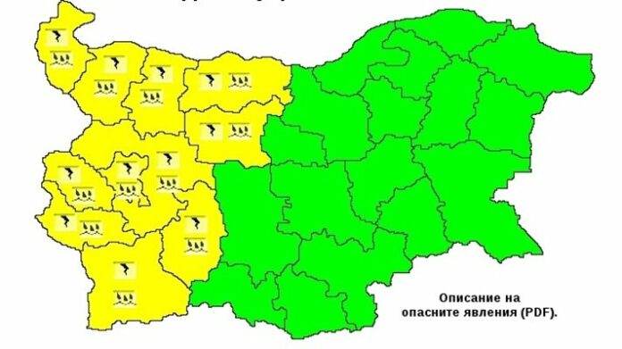 Жълт код е издаден за 11 области на страната за утре, 24 юни. Това показват данните на Национален институт по метеорология и хидрология (НИМХ). Предупреждението е в сила за София град, София област, Видин, Монтана, Враца, Плевен, Ловеч, Перник, Благоевград, Кюстендил и Пазарджик.