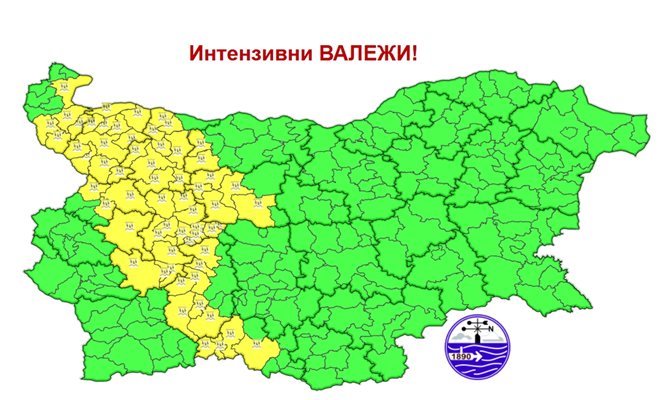 Обявиха жълт код за интензивни валежи, гръмотевични бури и повишена вероятност за градушки в областите София-град, София-област, Видин, Монтана, Враца, Плевен, Ловеч, Пазарджик и Смолян. Явленията ще се проявят основно около и следобед.