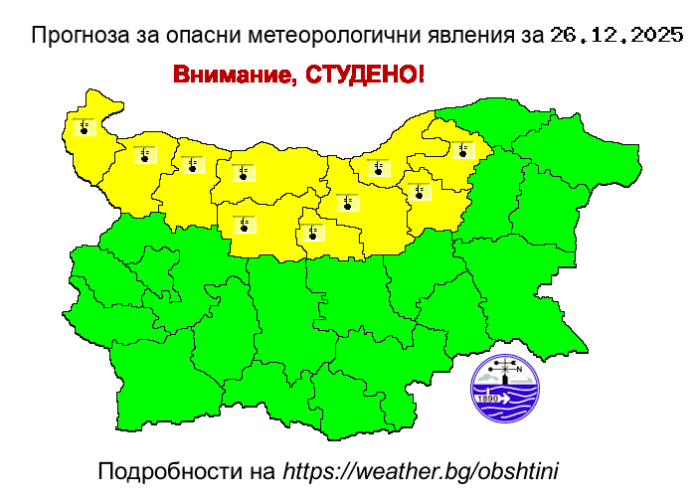Днес и през деня ще остане студено, особено в Северозападна и Централна Северна България – с температури дори през деня под нулата – затова за 10 области на България важи жълт код за студ – в областите – Видин, Монтана, Враца, Плевен, Разград, Ловеч, Габрово, Велико Търново, Русе и Търговище – днес през деня ще бъде най- студено. По морето има предупреждение за усилено морско вълнение и днес.