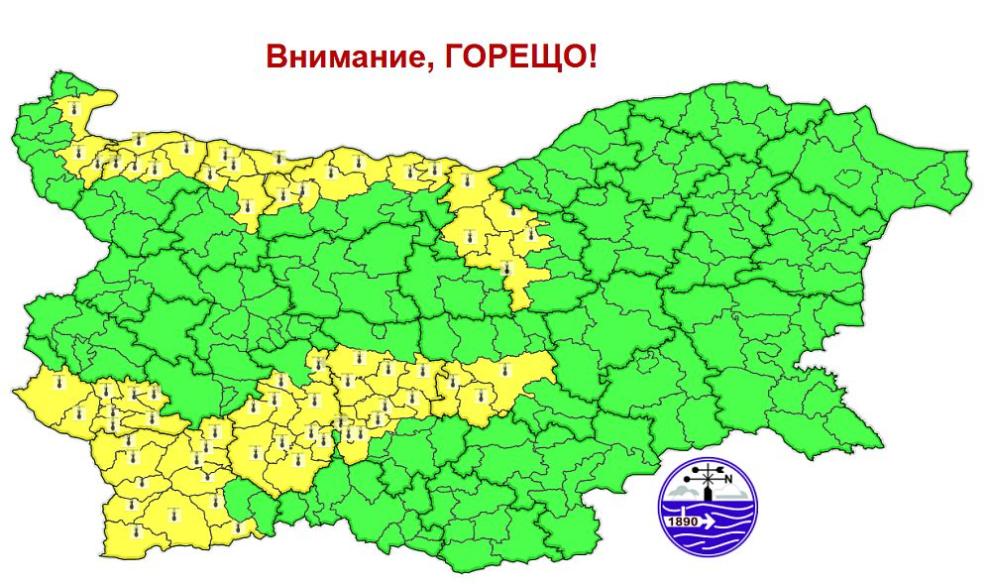 Националният институт по метеорология и хидрология издаде жълт код за потенциално опасно време – за високи температури, в 10 области.