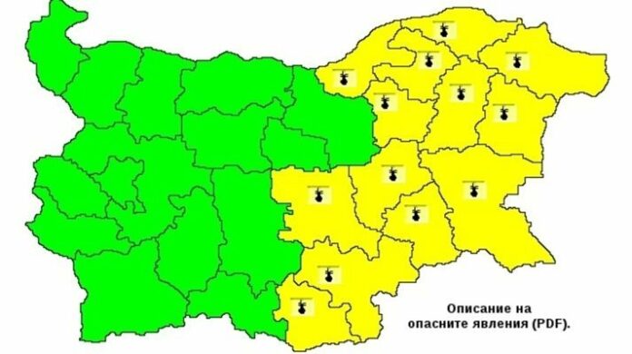 Жълт код за горещо време с максимални температури над 35° е обявен в 13 области в страната – Търговище, Варна, Шумен, Добрич, Разград, Кърджали, Хасково, Стара Загора, Русе, Силистра, Сливен, Бургас, Ямбол. Това съобщават от Националния институт по метеорология и хидрология (НИМХ).