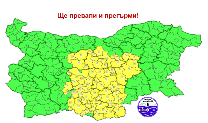 За много области в централните райони на страната отново е в сила предупреждение от първа степен за проливни валежи, градушки и локални наводнения – Кърджали, Смолян, Хасково, Пловдив, Стара Загора, Сливен, Велико Търново, Габрово, Ловеч и Търговище.