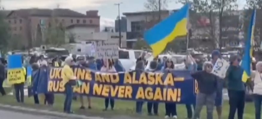 Жителите на Аляска посрещнаха Путин с украински знамена. Протестиращите започнаха да се събират рано сутринта, преди пристигането на Путин в Анкъридж, скандирайки лозунги в подкрепа на Киев и изисквайки Русия да върне 20 000 украински деца, отвлечени от зоната на военните действия.