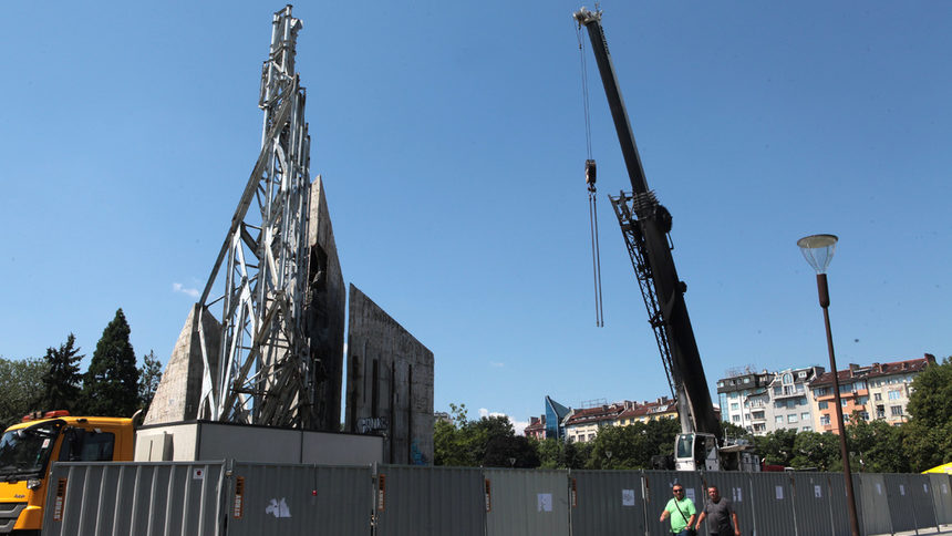 Кранът, който демонтираше паметника „1300 години България“ от пространството пред НДК, беше подпален в 03, 15 часа на 9 юли. Кранът бе напълно унищожен заедно с цялата командна система, затова ще бъде заменен с друг. От МВР съобщиха, че се работи по изясняване на обстоятелствата около палежа и разкриването на извършителите. Демонтирането на релефните фигури от паметника „1300 години България“ трябваше да приключи по график до 30 юни, но работата ще се забави със седмица заради палежа на крана. Нанесените от палежа щети са около 1 млн. лв.
