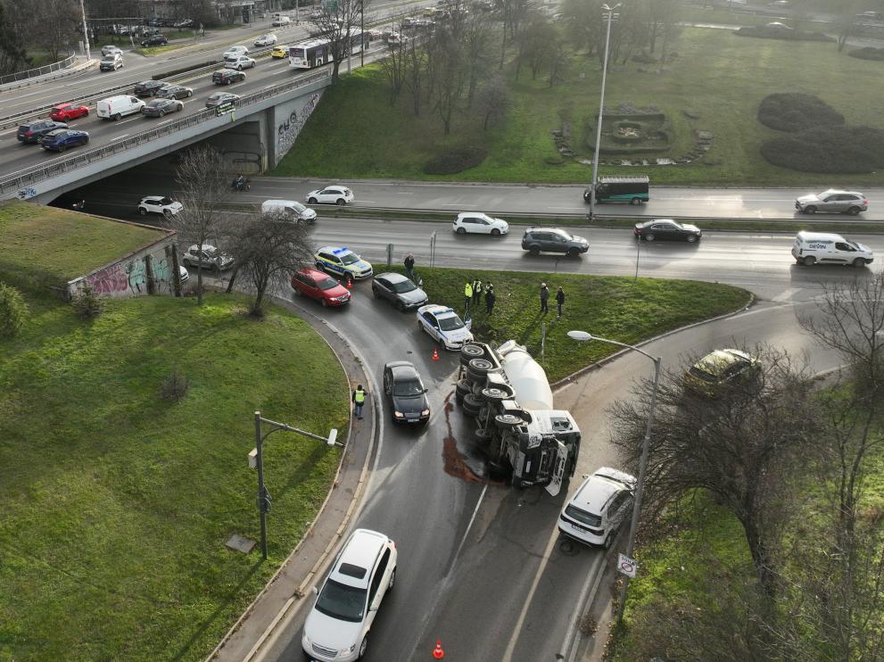 Бетоновоз се обърна на разклона на бул. „Пейо К. Яворов“ за бул. „Цариградско шосе“ в София. Инцидентът е станал във вторник сутринта.