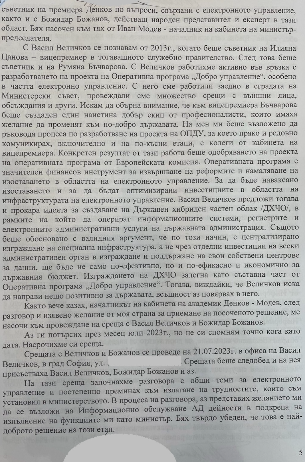 „Предвид необходимостта от решение на Министерския съвет трябваше да проведа разговор с Васил Величков, който предстоеше да бъде назначен за съветник на премиера Денков по въпроси, свързани с електронното управление, както и с Божидар Божанов, действащ народен представител и експерт в тази област. Бях насочен към тях от Иван Модев – началник на кабинета на министър-председателя“, заявява Йоловски, с което дава да се разбере, че бившият премиер е бил запознат със случващото се в ресора.