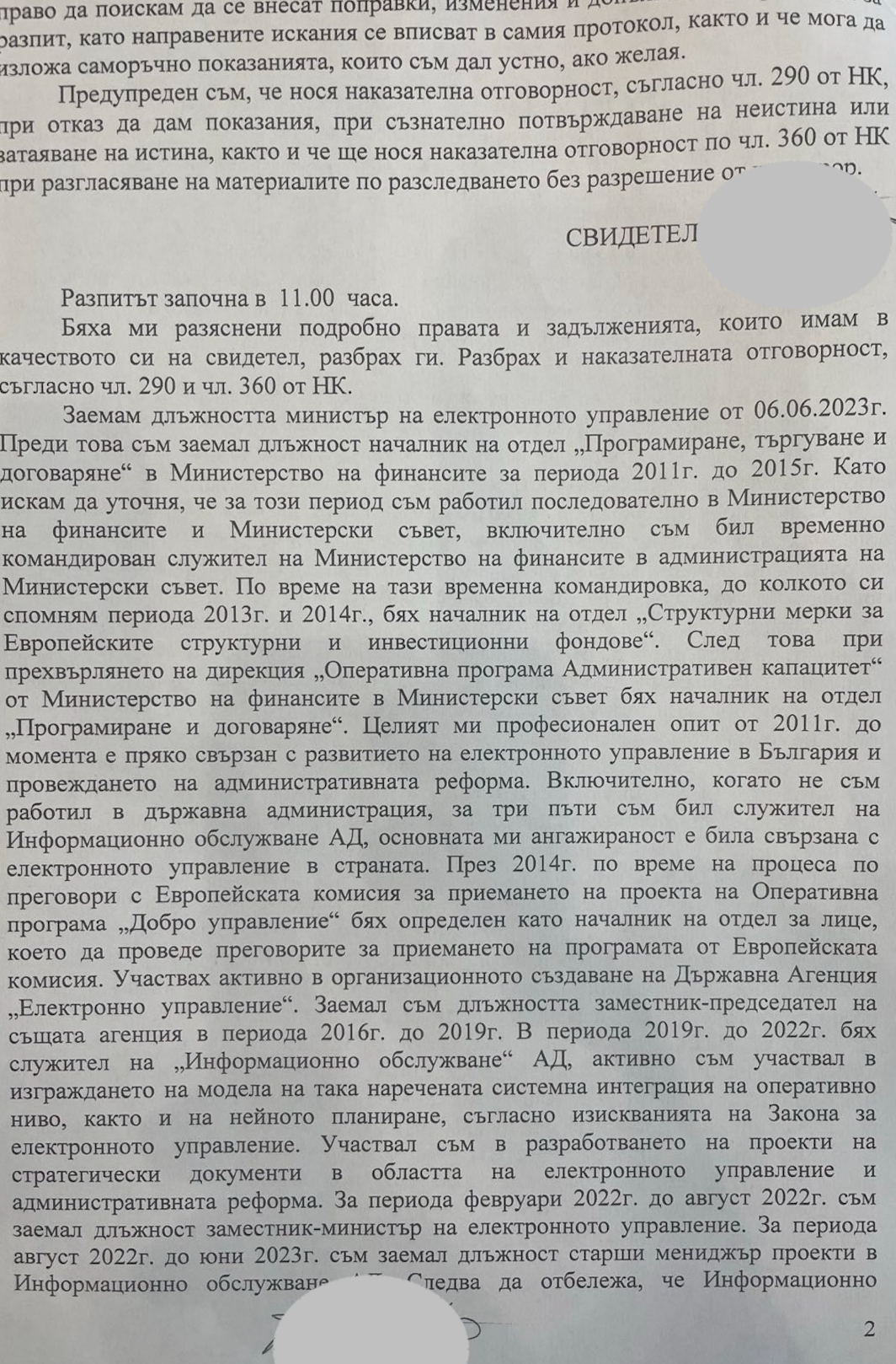 Разпитът на Александър Йоловски е проведен от прокурор от Софийска градска прокуратура на 29 октомври 2023 г. Започва в 11.00 часа преди обед и приключва минути преди 22.00 часа, като всичко изложено се съдържа на 11 страници. Бившият министър разказва подробно, че е поканен на поста лично от бившия премиер Николай Денков, който имал добри впечатления от предходната му работа като заместник-министър на електронното управление в правителството „Петков“.