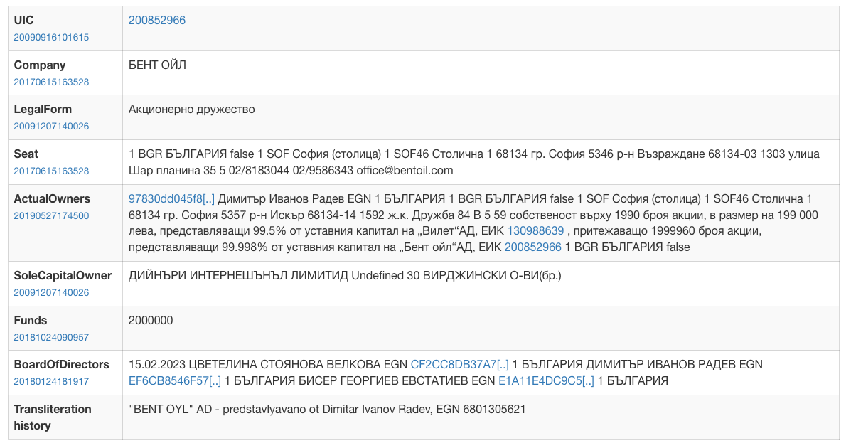 Справката на “Биволъ” в Търговския регистър и търсачката на медията ни сочи, че акционерното дружество “Бент ойл” е на вписаната като “едноличен собственик на капитала” офшорна фирма, регистрирана в Британските вирджински острови (БВО) – “ДИЙНЪРИ ИНТЕРНЕШЪНЪЛ ЛИМИТИД”.