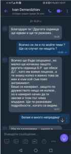 Неизвестен: Какво се случва? Вече не вдигаш тел, а обеща всичко да бъде ок по моята тема. Изчаках да приключите с Д.Г., след това и Автомагистрали и сега се покри. Бях точен с парите когато каза, обеща ми бързо развитие, а сега се криеш…Какво се случва?