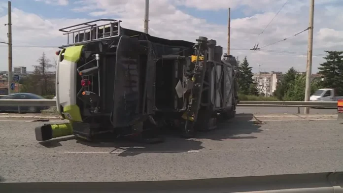 Комбайн с румънска платформа се обърна и блокира булевард „България“, който е един от най-натоварените в Русе. Затворени са две от трите ленти за движение в участъка.