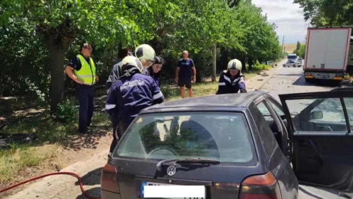 Затиснат в автомобила си е водачът на леката кола, който е от село Попинци. Той все още не е изваден от превозното средство, контактен е.