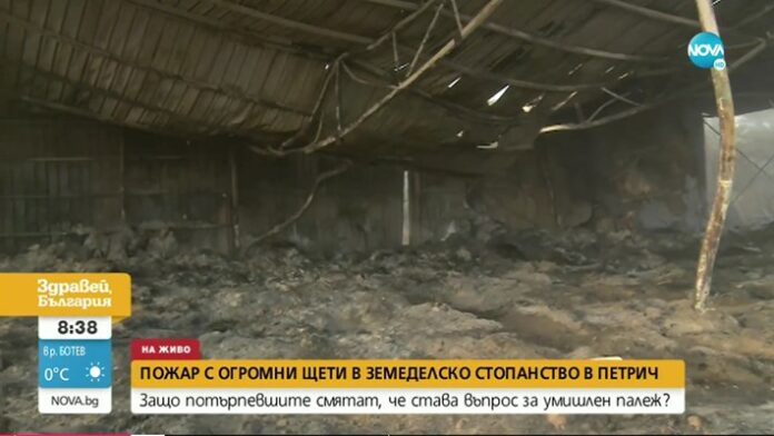Пожар с огромни щети унищожи стопанство в Петрич. Според потърпевшите става дума за умишлен палеж. Унищожен е хамбар, в който се съхранявала храната на стотици животни за зимата. На мястото са открити туби, в които е имало бензин. Земеделците са украинци, които отдавна живеят в града, съобщи Нова телевизия.