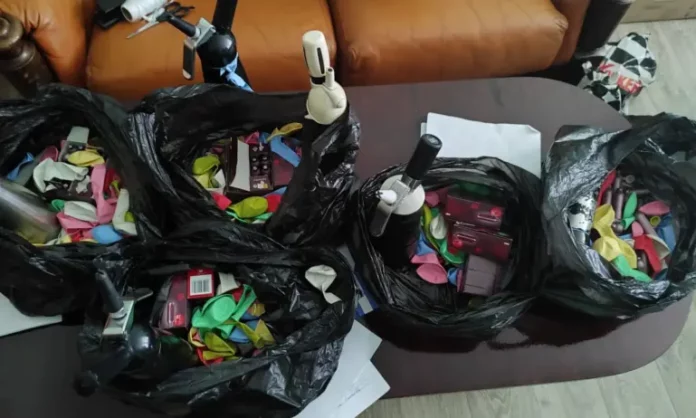 Множество флакони райски газ бяха открити в заведение в София при акция на Икономическа полиция в СДВР. По първоначални данни те са малко над 450.