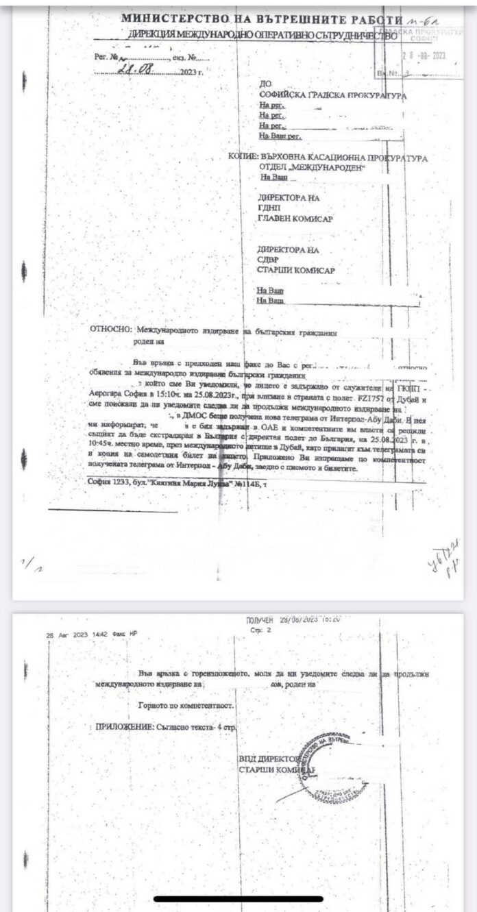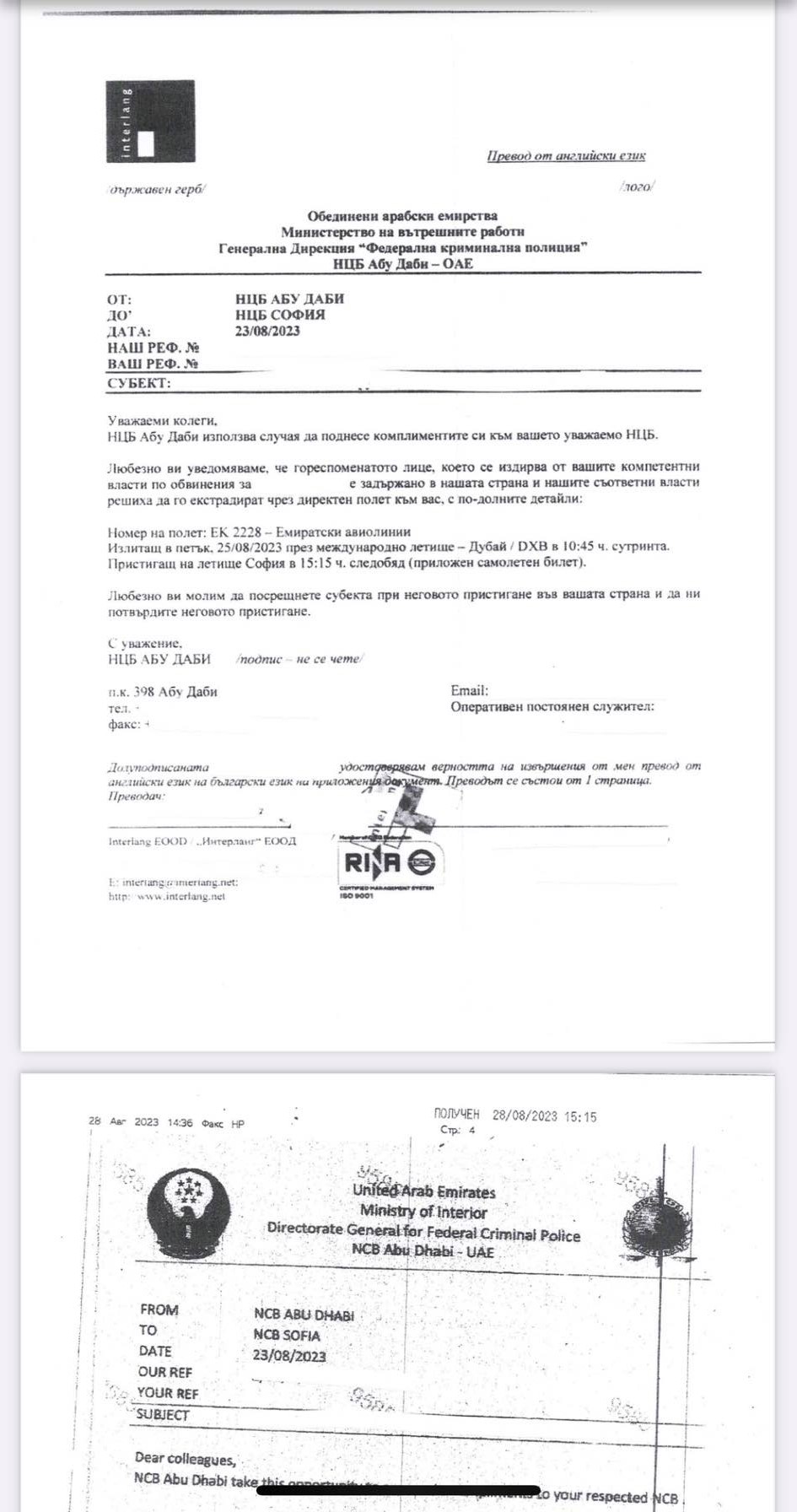 В документите е посочено, че компетентните власти на ОАЕ са решили да екстрадират българския гражданин с директен полет от Дубай до София. Допълнително е посочено, че полетът е на 25.08.2023 г., като самолетът каца на летището в гр. София в 15:15 часа.