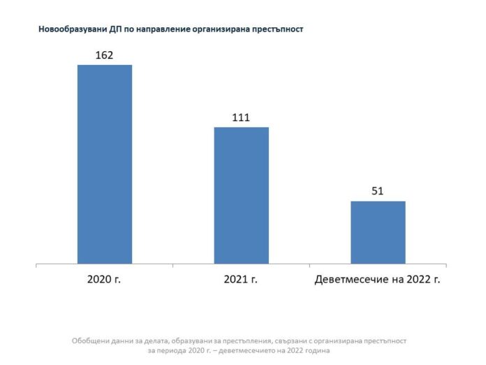 Същевременно е налице тревожна тенденция за това, че в същия период се наблюдава чувствителен спад в постигнатите резултати в борбата с организираната престъпност, в частност с разкриването на организирани престъпни групи. Този спад се дължи на закриването на Специализираната прокуратура, доказала своята ефективност за борба с организираната престъпност. За деветмесечен период на 2022 г. са новообразувани едва 51 досъдебни производство по направление организирана престъпност. За разлика от 2020 г., когато те са били три пъти повече. Осъдените лица за участие в ОПГ през 2020 г. са 131, през 2021 г. – 145, а за деветмесечието на 2022 г. броят на осъдените лица за ОПГ спада до 62 лица.