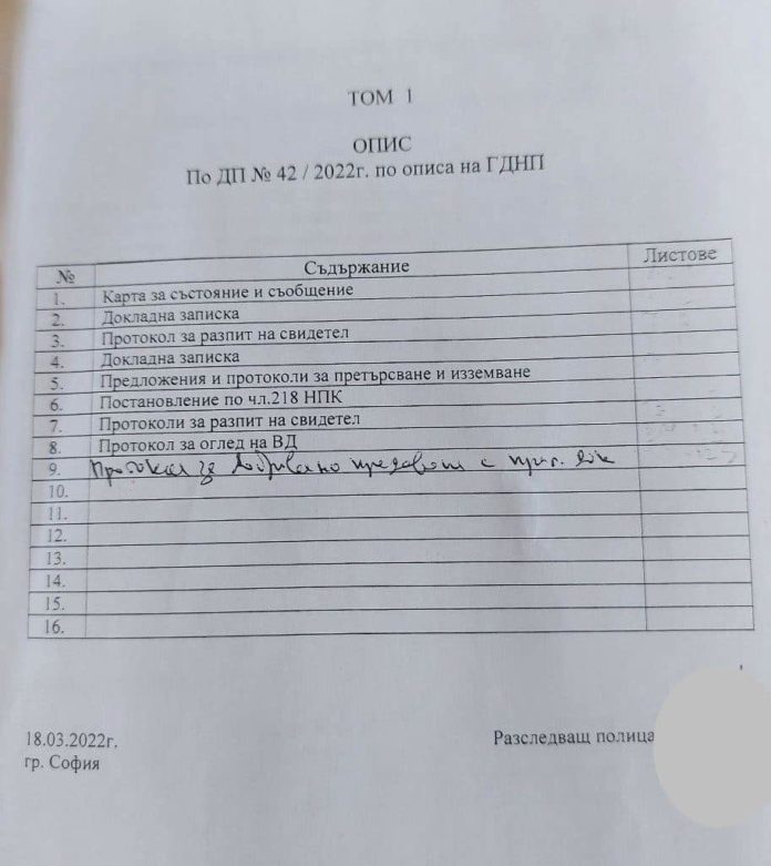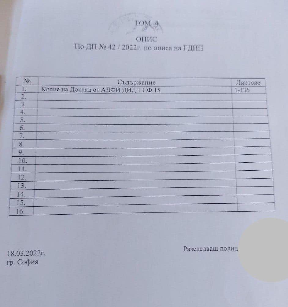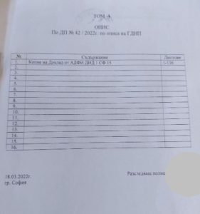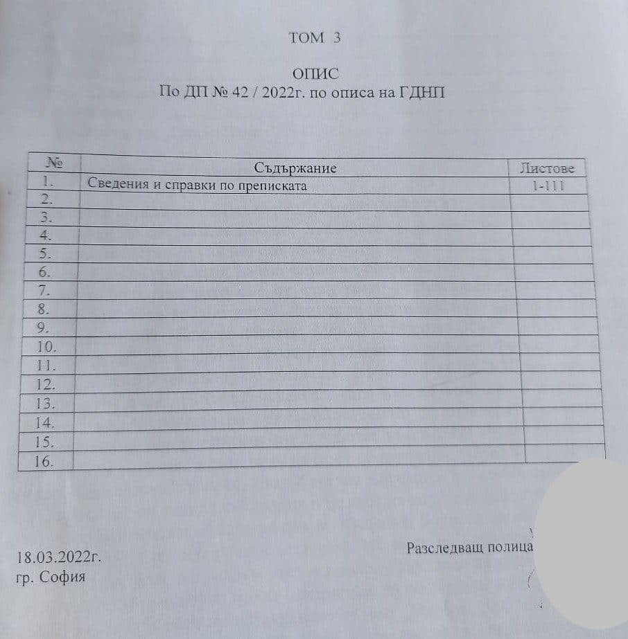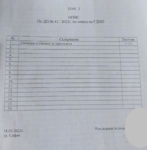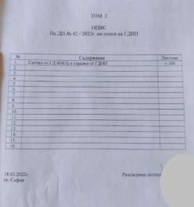 На снимките виждате официалните описи на постъпилите от ГД „Национална полиция“ в Софийска градска прокуратура четири тома с материали по досъдебно производство спрямо три политически лица.