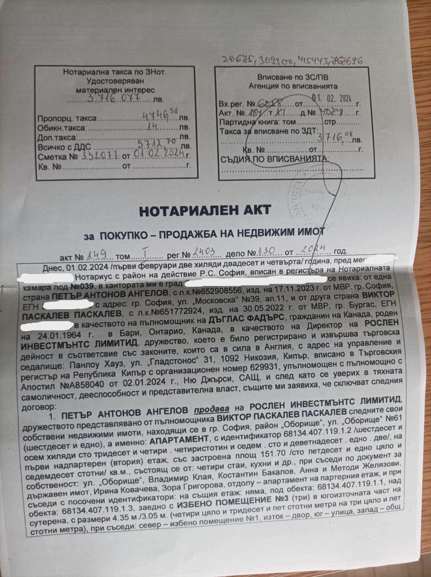 Петър Ангелов, представен в нотариалния акт като „единствен собственик на имота“ продава просторното жилище с четири стаи и обща площ от 151 квадрата на канадската фирма „Рослен Инвестмънтс“, чрез неин пълномощник в България.