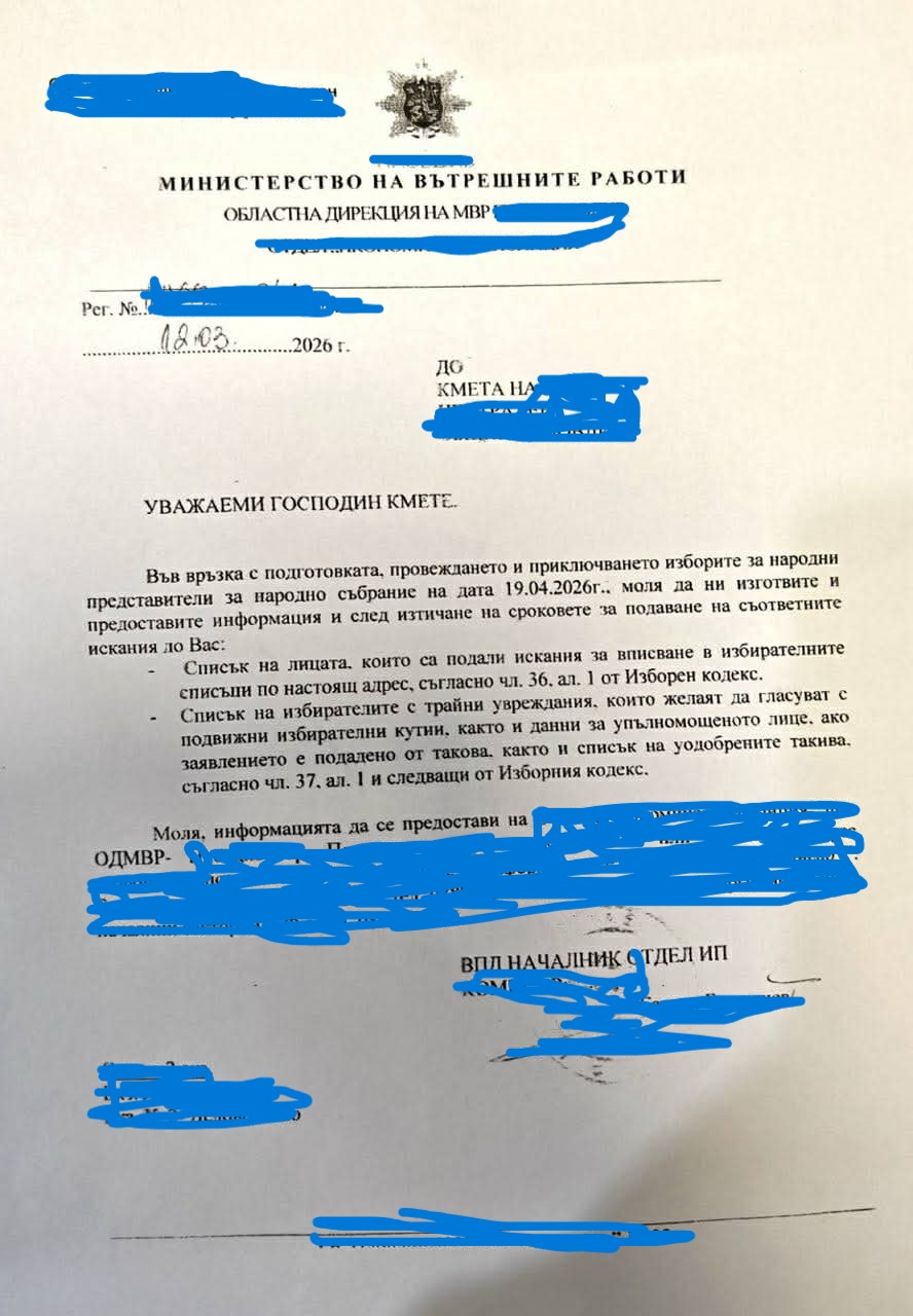 Но това не е всичко. Според друг документ, с който медията също разполага, отделите „Икономическа полиция“ в областните дирекции на МВР изискват от кметовете: „Списък на лицата, които са подали искане за вписване в избирателните списъци по настоящ адрес“ и „Списък на лицата и списък на избирателите с трайни увреждания, които желаят да гласуват с подвижни избирателни кутии и данни за упълномощеното лице“.