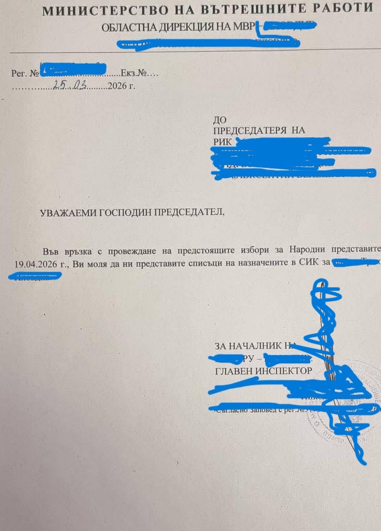 МВР изисква от председателите на районните избирателни комисии данните-имена и лични данни на всички членове на секционните избирателни комисии без мотиви. Това научи Breaking.bg от потърпевши. Медията разполага и с документ, в който началник на РПУ изисква от председател на Районна избирателна комисия пълен списък „на назначените в СИК“ за района. Документът е с дата 25 март 2026 година.