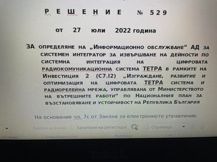 По идея на министъра на електронното управление Божидар Божанов от ДБ, който също присъства на срещата, е решено по спешност поръчката за доизграждане на системата ТЕТРА-МВР да се възложи на държавната фирма „Информационно обслужване“АД.