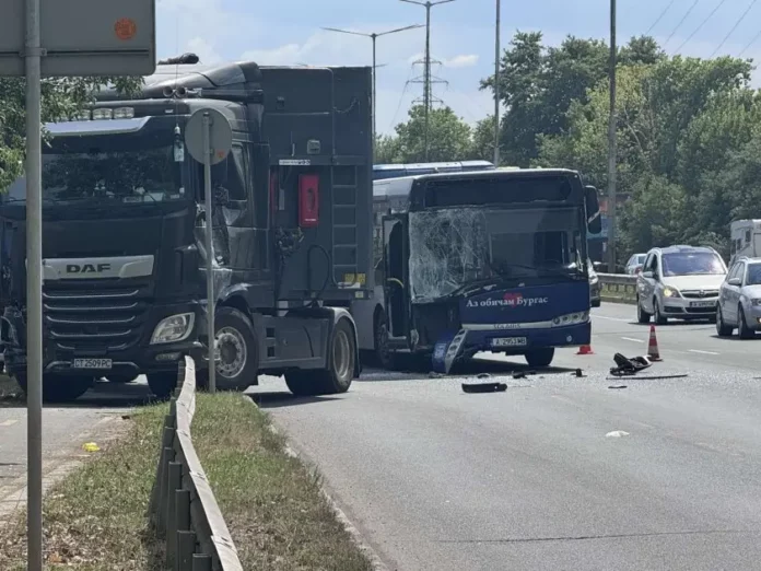 Тир блъсна пълен с пътници автобус от градския транспорт на Бургас. Инцидентът е станал малко преди 15:00 часа.