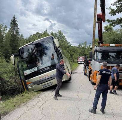 Пътниците вече за извозени към Боженци. Пробите за алкохол на водача са отрицателни. На място са екипи на полицията. Очаква се автобусът да бъде изтеглен.