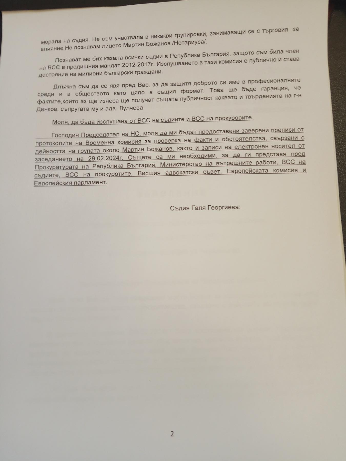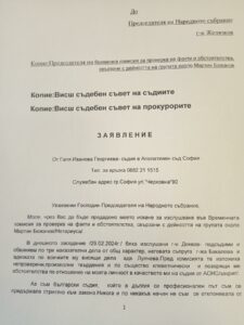 Цял месец вече отлежава в Народното събрание входираното искане от 1 март на съдията от Софийския апелативен съд Галя Георгиева, която настоява да бъде изслушана от временната комисия за Мартин Божанов-Нотариуса, ръководена от Никола Минчев от ПП-ДБ. Един месец отлежава същото й искане и ВСС, където тя поиска да бъде изслушана и от двете колегии прокурорската и съдийската. Но я изслуша само първата.